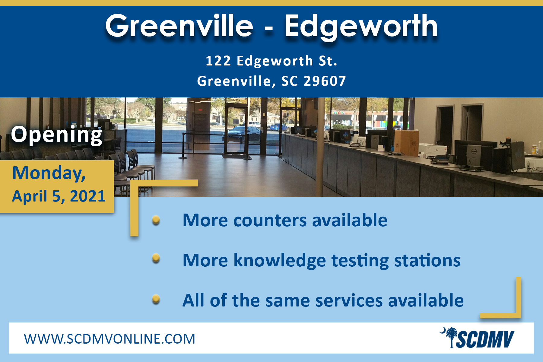 South Carolina Department Of Motor Vehicles The New Scdmv Office In Greenville Is Officially Open At 122 Edgeworth Street Customers In Greenville Can Now Visit Our New Office Located At 122